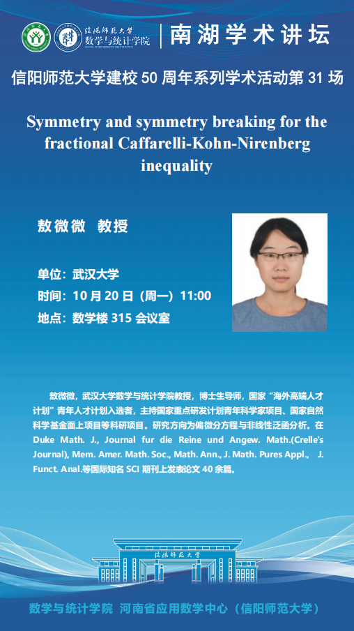 庆建校50周年之南湖讲坛:武汉大学敖微微教授——Symmetry and symmetry breaking for the fractional Caffarelli-Kohn-Nirenberg inequality